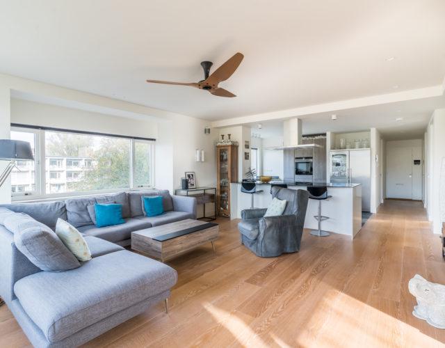Centraal in de woning de prachtige ruime open keuken in U-opstelling met mooie brede lades/ veel opbergruimte. Luxe dubbeldeurs koelkast met wijnklimaat gedeelte. Alle denkbare inbouwapparatuur en aan het grote kookeiland ook een bargedeelte met plek voor zeker 4 personen. En niet te vergeten het uitzicht vanuit het keukenraam. De royale living geniet aangenaam daglichtinval vanwege de hoek-/kopligging van het appartement met grote ramen aan 3 zijdes. Goed bemeten (tweede) balkon aan woonkamerzijde op het westen en nog een zonnig (derde) balkon aan de eetkamerzijde op het zuiden. Deze ruimte heeft als detail leuke nissen voor boekenkasten en deelt de op afstand bedienbare gashaard met de hoofdslaapkamer op ingenieuze wijze. Tot slot een eigen berging op de begane grond en toegang tot twee gemeenschappelijke fietsenbergingen.